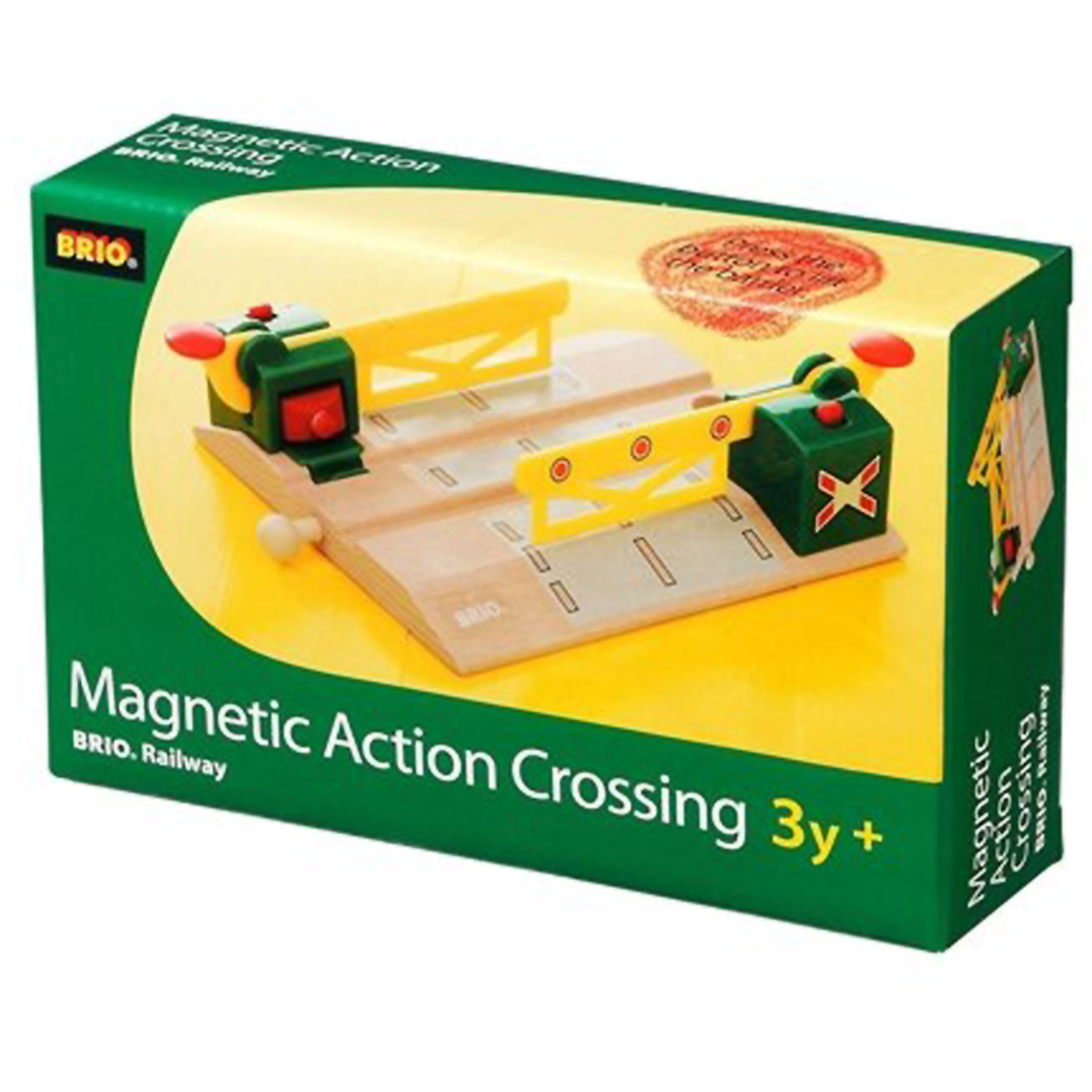 Opgelet! Stoppen aan de overweg! En ja, hoor, daar komt de trein aan. Gelukkig sluiten de slagbomen automatisch door de magnetische kracht tussen trein en slagbomen. Je kan de slagbomen ook manueel bedienen. De magnetische overweg past naadloos aan de andere sporen van Brio.
